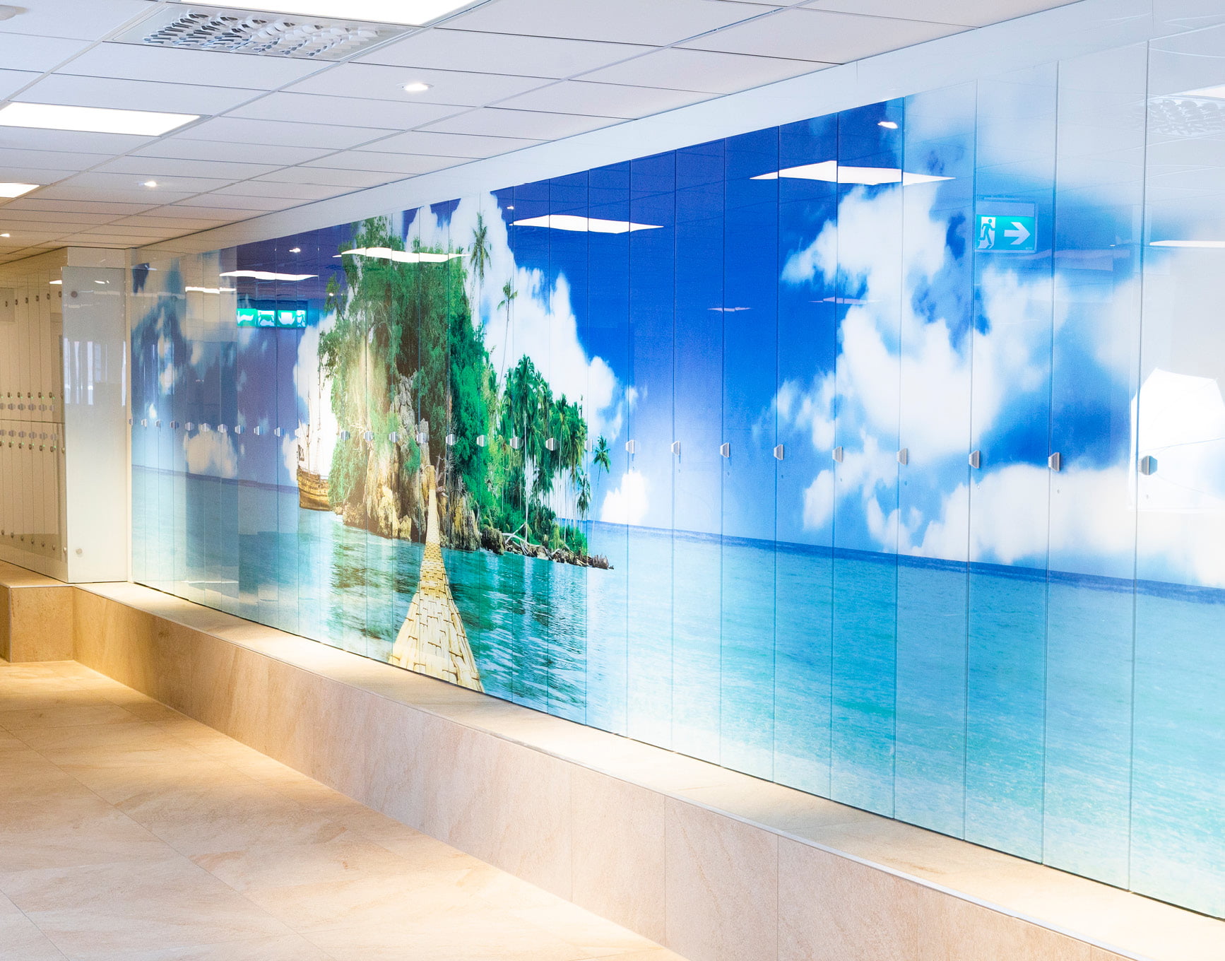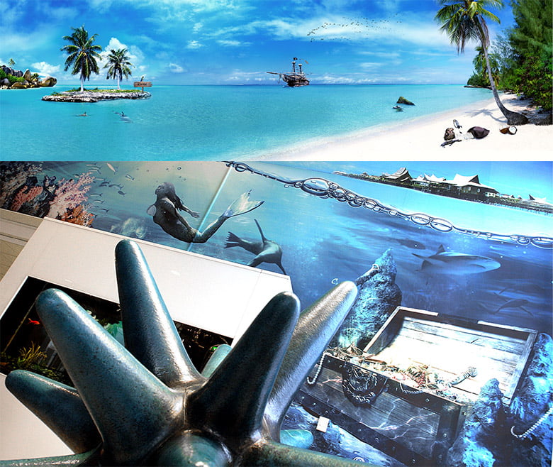 Redan i entréhallen möts besökaren nu av en 40 kvadratmeter stora undervattensbild som är bakgrundsmotivet till konstnären Hans Hedbergs konstverk ’Sjöborre’. Där sätts det genomgående temat, som är Söderhavet och pirater. Ett tema som därefter följer besökaren genom anläggningens olika delar, men med olika bildspråk och färgval beroende på del.